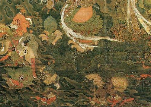 공양인물군상에 대해 기존에는 ‘삼국유사’의 낙산성굴설화에 의거해 용왕과 권속들을 표현한 것이라는 견해가 주를 이뤘다. 하지만 실체와 상징하는 바를 구체적으로 따져야 한다. 선두에 다소 크게 묘사된 남성인물상(①)은 손에 병향로를 쥐고 머리에 흰 뿔장식이 있는 冠을 착용했다. 금색 당초운문이 장식된 大袖衣의 紅袍를 걸치고, 턱수염이 정돈된 모습은 제왕을 연상시키는데, 이 인물은 해중에서 해수면 위로 출현한 海龍王임에 틀림없다. 관 양쪽에 솟아오른 뿔장식이 海龍의 두부에 뻗어나온 뿔을 가리키는 모티브로, 俗人의 모습을 한 용왕으로 볼 수 있기 때문이다.