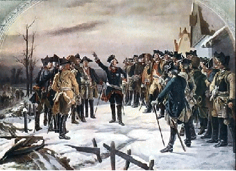 프리드리히 대제가 로이텐 교회 앞에서 지휘관들에게 연설을 하고 있다.