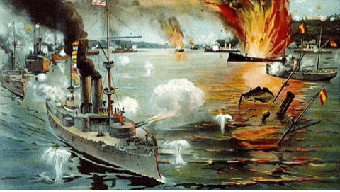 한편 개전과 동시에 홍콩에 머물러 있었던 듀이(George Dewey) 제독 휘하의 해군파견대는 미해군차관 루스벨트(Theodore Roosevelt)의 명령을 받고 마닐라의 스페인 해군기지를 기습 공격했다. 그는 4월 30일 야간공격으로 쉽게 마닐라 만을 장악하고 스페인 군함을 모두 격파했다. 지상군이 준비되지 않은 상태에서 그는 제7군단이 도착할 때까지 기다리다가 8월 14일에야 마닐라를 함락시키고 전쟁을 종결지었다.